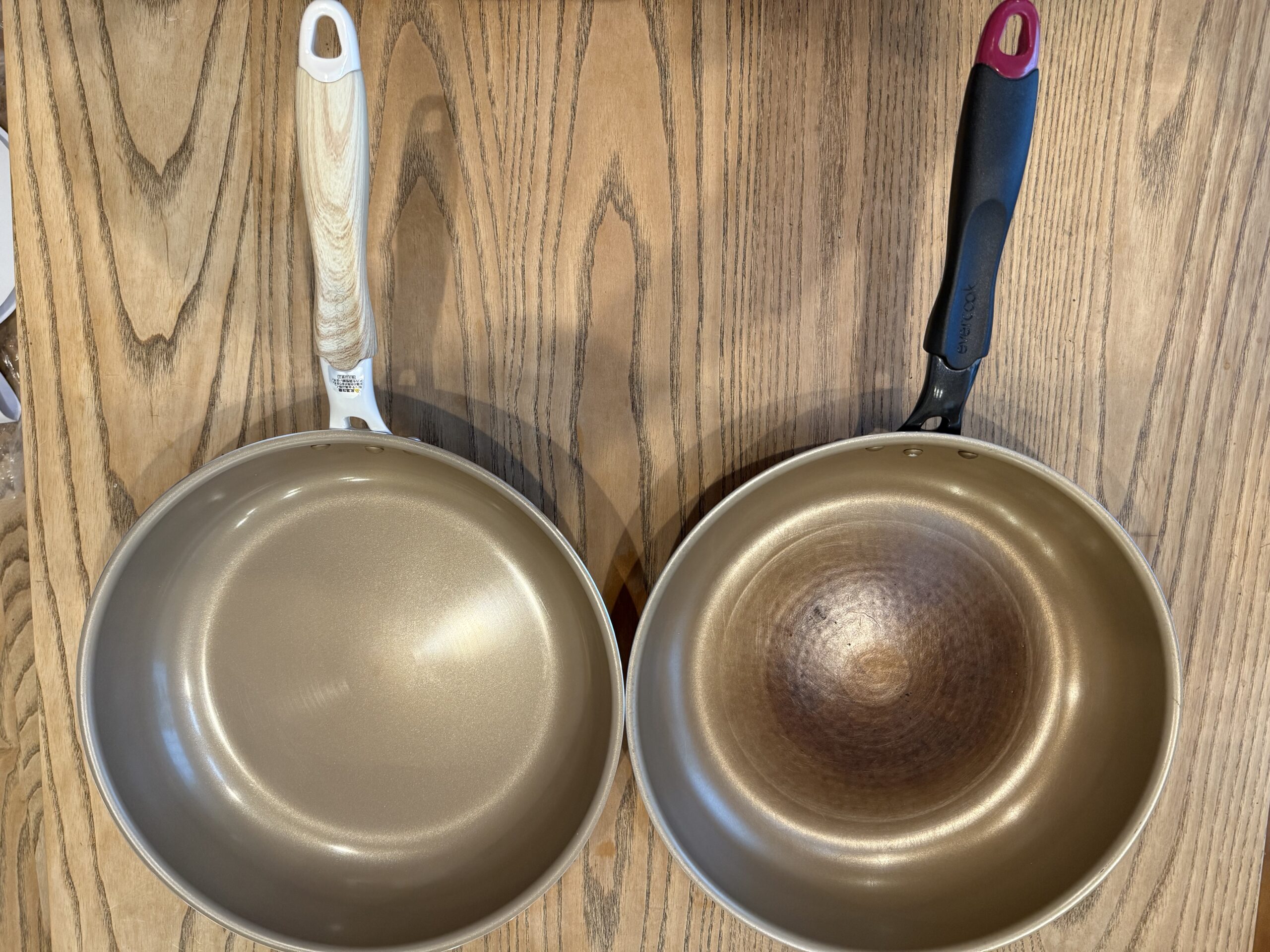 写真右側が3年間ほぼ毎日のように使ってきたエバークックのフライパン。